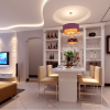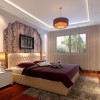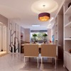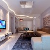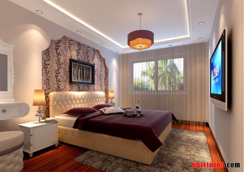 卧室的设计给人一种非常舒适现代时尚的感觉,在客厅的顶面上是一圈明亮的灯带,在灯带的周边松散的排列着一些射灯,在顶面中央的位置是一盏圆形的橘黄色的吊灯,搭配深色的实木地板,营造出非常和谐优雅的居室环境。在床头背景墙上采用石膏板设计出一个向墙面内凹陷的简欧风格的拱门,拱门的里面铺贴现代简约的壁纸,带给人非常优雅大气的视觉感受。