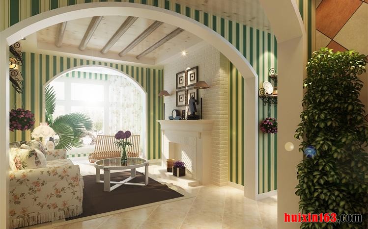 在客厅和餐厅的墙面上都采用了绿色和黄色相间的条纹的墙纸作为装饰,能够有效的拉伸空间的高度,同时绿色和室内摆放的绿植鲜花相呼应,给人一种整体比较清新的自然田园的气息。碎花纹图案的沙发搭配墙面上的铁艺支架的隔板,在加上圆形的实木小茶几,漂亮的像是一把小伞造型的台灯,给人非常舒适您经的感受。在电视背景墙的位置设计了一个装饰壁炉,可以作为小物件摆放的平台,也为电视打造了一个比较切合的空间。