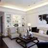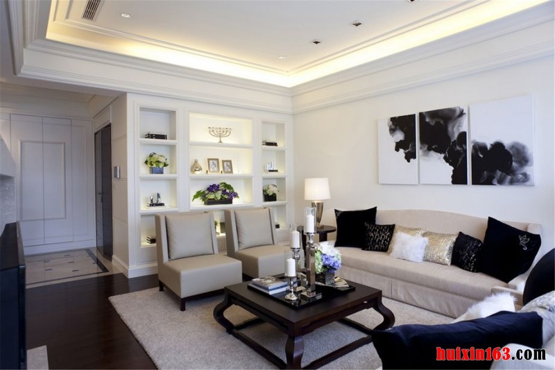 客厅的布置可以说是非常的简约和精妙,在拐角处的一面短墙上设计了一整面墙的格子空间,在上面可以摆放一些清新的绿植和一些精美的小摆件以及漂亮的具有纪念意义的照片。在沙发背景墙上是三幅特别抽象的中国画,浓郁的墨色,让人浮想联翩,很有中国山水的意境。在顶面上的吊顶结构呈现出排列非常规则的层次感,石膏线条之间夹杂着灯带,灯带环绕的区域,设计了精心布局的射灯,在保持顶面的设计整齐划一的前提下,保证了整个空间的亮度。