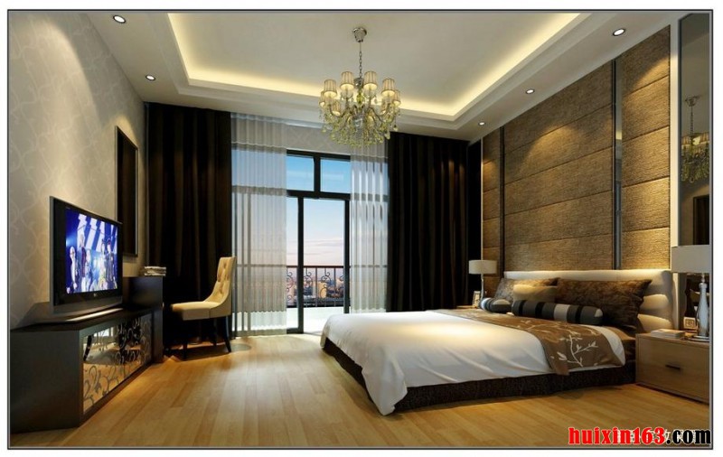 主卧的设计非常的简约大气,在顶面上设计了非常简约大方的吊顶结构,中央是一盏金黄色的水晶灯,周边局部吊顶结构的设计让空间看起来更高,更加的宽敞。在地面上铺设原木色的实木地板,会带给人非常清新自然的感受,在卧室里面摆放电视更加符合轻松惬意的生活姿态,晚上躺在床上看电视也是一件非常放松的事情。在床头背景墙上采用深黄色的软包装饰,搭配射灯光线的照射,给人一种非常优雅大方的感觉。