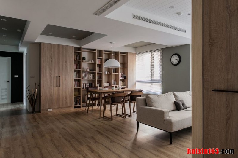 在客厅的电视背景墙上采用文化砖装饰,顶面上是排列整齐的文化砖,整体的搭配给人非常简洁质朴的感受。地面上是赭石色的实木地板,搭配颜色更加深的实木的茶几和电视柜以及休闲风格的靠背椅和脚凳,展现出一种非常优雅休闲的生活格调。在阳台的上方安装了中央空调,这里的吊顶更加的低,但是由于窗子设计的比较的大,光线非常的充足,顶面的颜色又是白色的,给人的感觉很舒服,没有任何压抑的感觉。