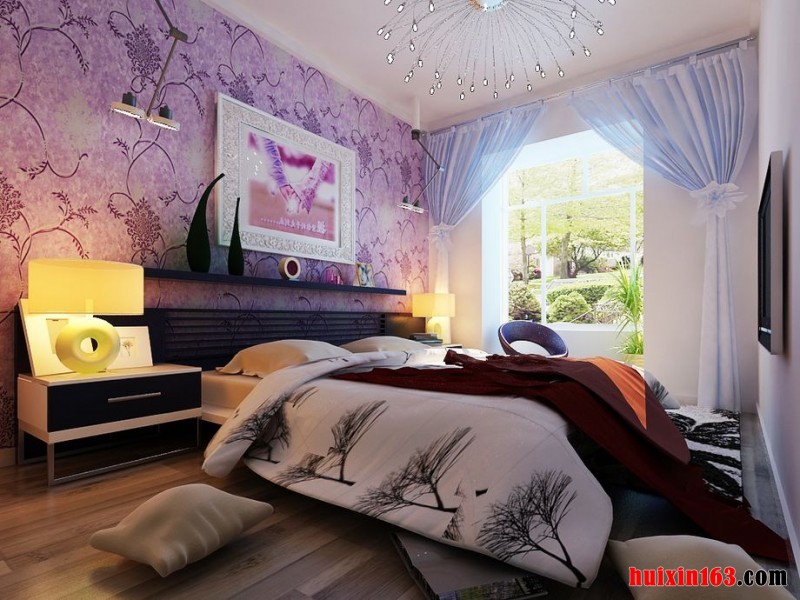 客厅的装饰给人的最深的印象就是用色非常的大胆,紫色的沙发,深红色的地毯,原木色的方形茶几,浅色的实木地板,打造出一个色彩丰富的空间。在客厅的顶面上采用石膏板环绕出一个曲边的长方形,在顶面上还环绕了一圈时尚明亮的灯带,均匀分散的点缀着一些明亮的射灯,在沙发背景墙上是一张巨幅的淡紫色的关于素描的壁纸,一个黑色背景的美女的图画,为空间增添了些许时尚的元素。
